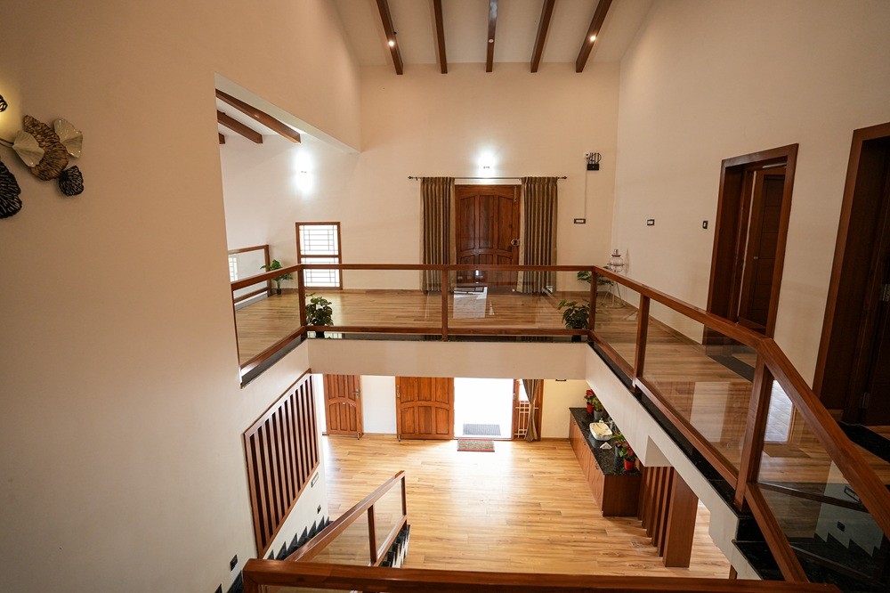 Enjoy a beautiful open view from the first floor balcony overlooking the elegant ground floor living room.